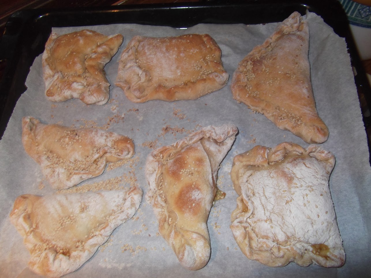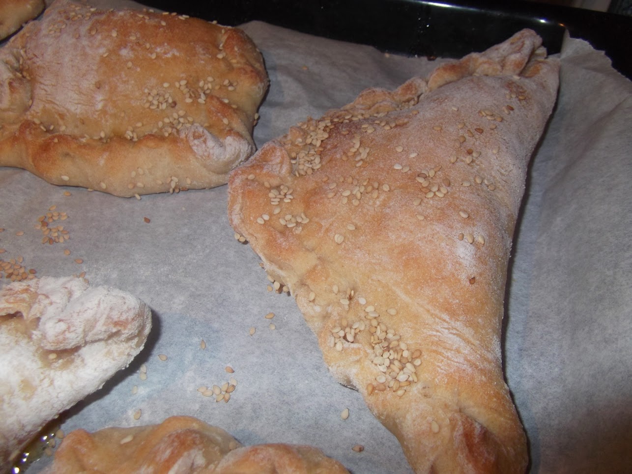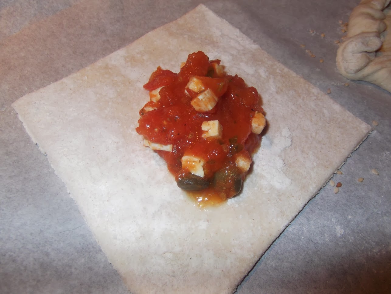 Quando sarà trascorso il tempo di lievitazione, stendere l'impasto con il mattarello fino ad ottenere uno spessore di circa mezzo centimetro, tagliare dei quadrati di circa 10 cm., versare un po' di ripieno nel centro di ogni quadrato, ripiegarli formando dei calzoncini e chiuderli bene sui bordi.