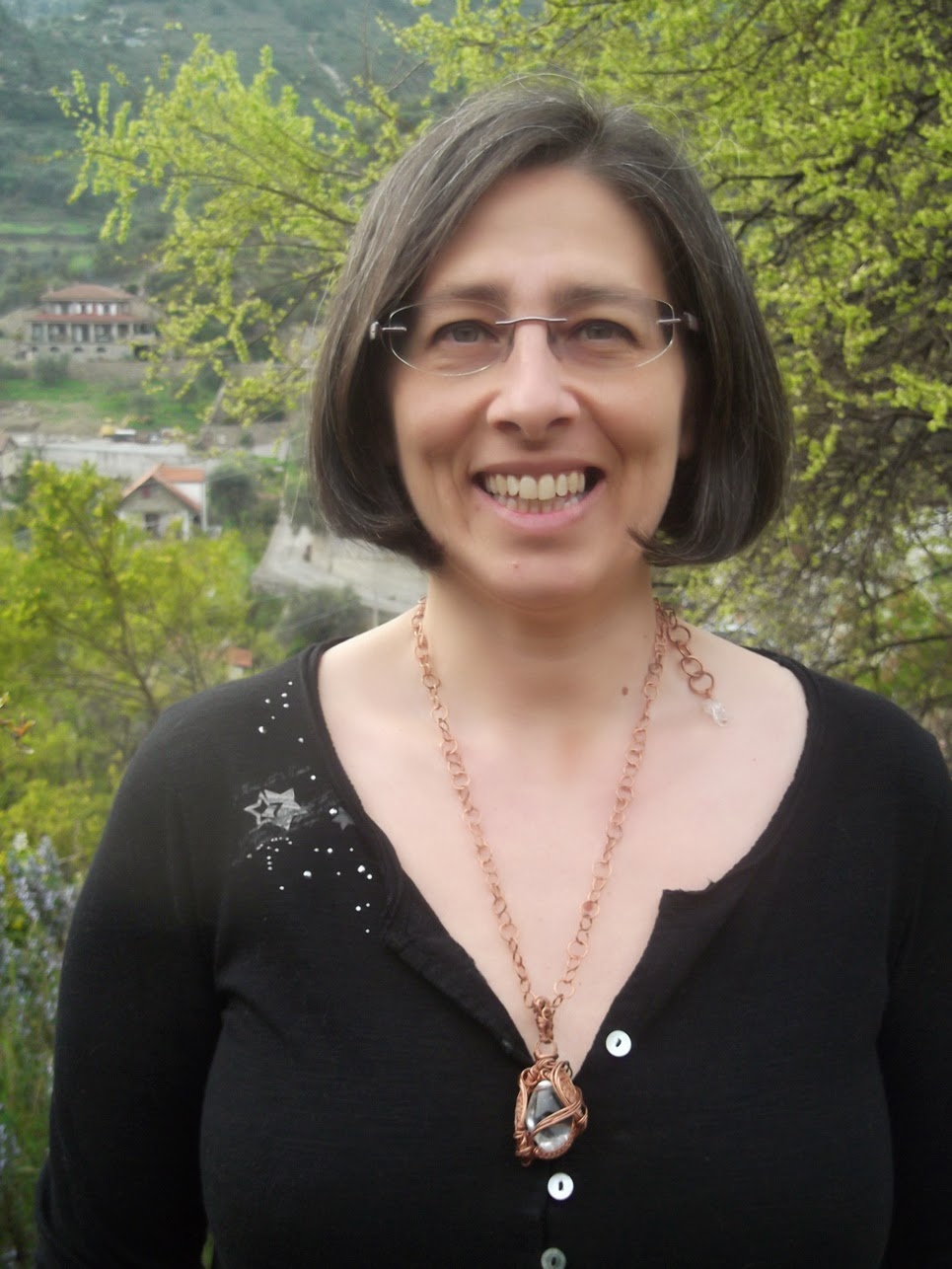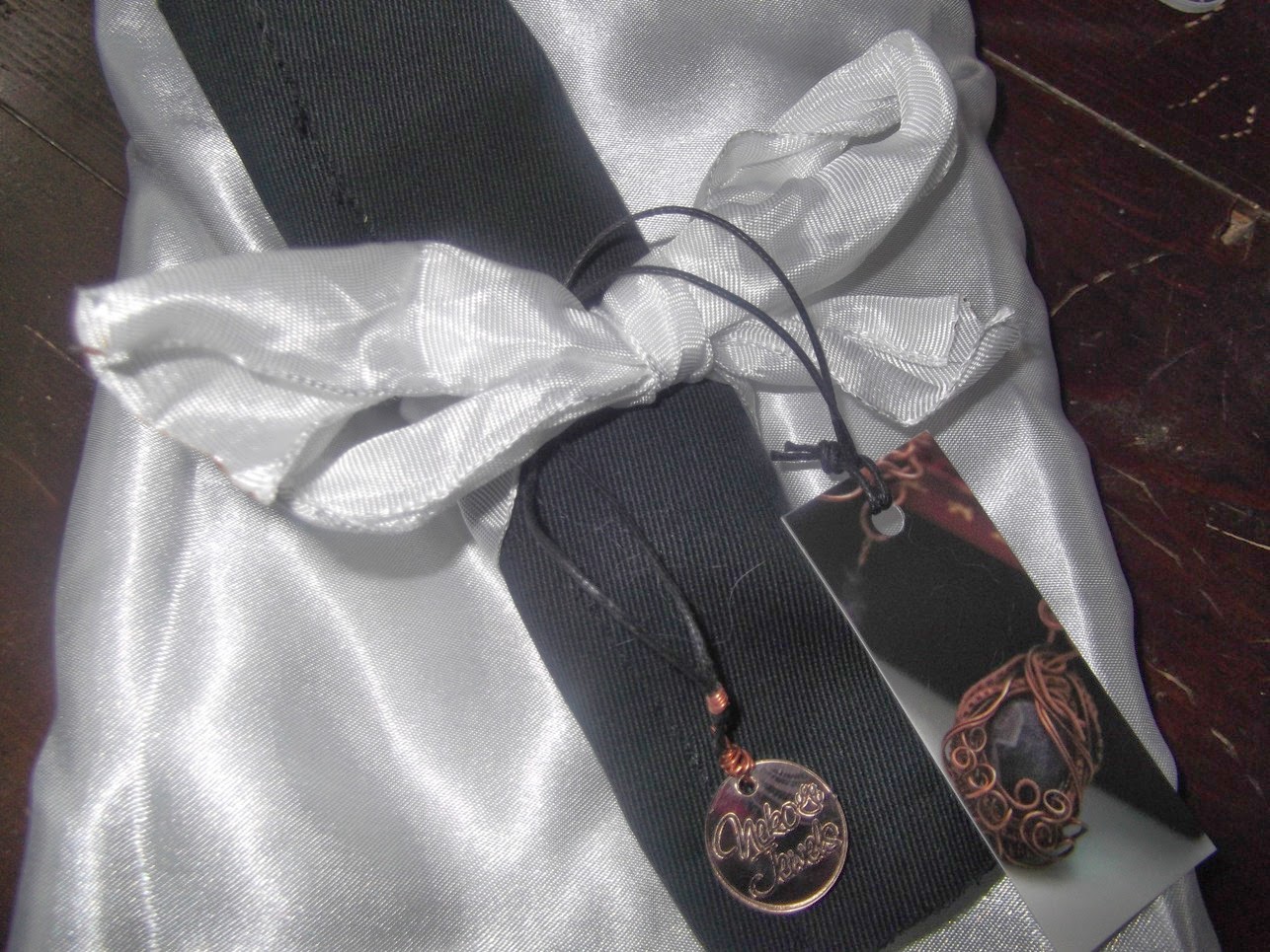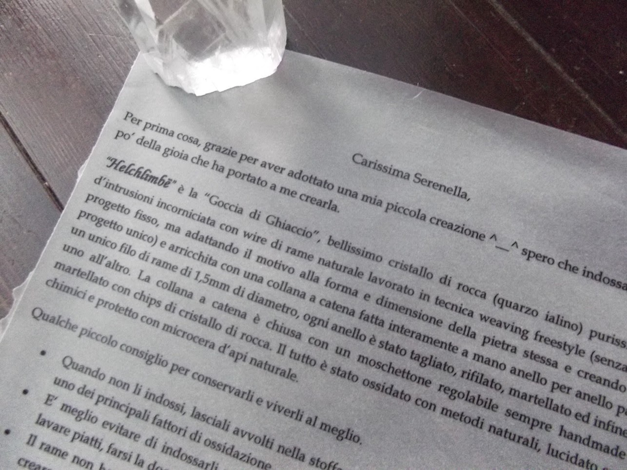 La pietra ho potuto sceglierla personalmente tra un vasto assortimento (io amo moltissimo il cristallo di rocca) e Michela mi ha spiegato che il pendente è stato realizzato con la tecnica del weaving freestyle e cioè senza seguire un progetto fisso, ma adattando il motivo alla forma ed alla dimensione della pietra e creando quindi un progetto unico. Io direi che ha fatto un ottimo lavoro, che si "sposa" perfettamente con il cristallo!