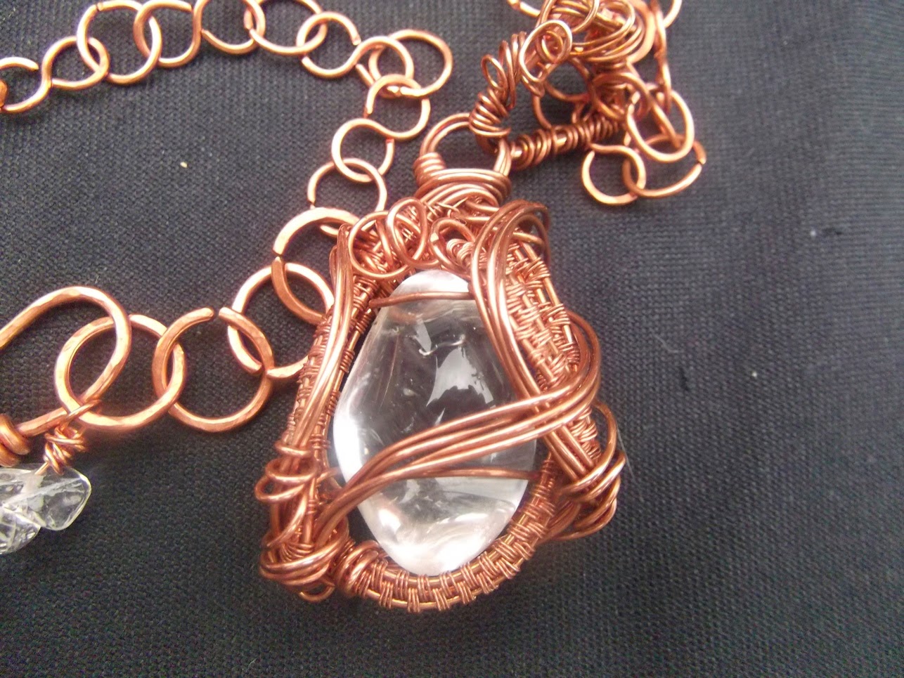 Ma ora veniamo a lei, la mia collana composta da un pendente realizzato con una bellissima pietra di cristallo di rocca purissimo incorniciata con wire di rame naturale e da una catena in rame martellato, il tutto ossidato con metodi naturali e senza agenti chimici.