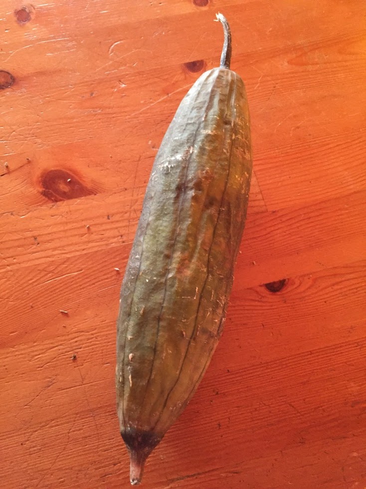 I frutti sono verdi, di forma allungata e cilindrica, sembrano una via di mezzo tra le zucchine e i cetrioli; pare che da giovani siano anche commestibili, ma un po' amari....io non li ho mai assaggiati!