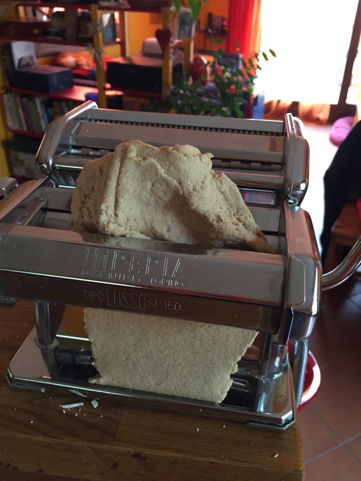Con la macchina per fare la pasta, impostata allo spessore 4, ho lavorato l'impasto suddiviso in piccoli pezzi, fino ad ottenere delle sfoglie belle lisce, tagliandole poi della lunghezza giusta.