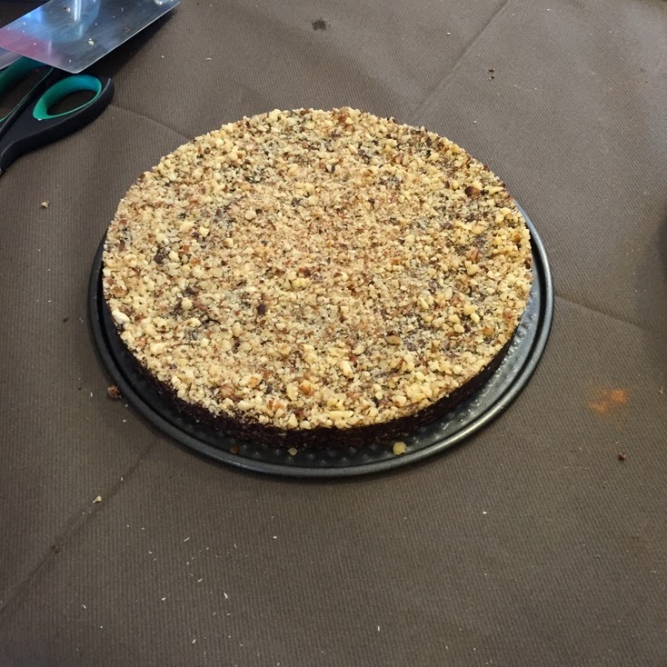Per fare il primo strato, la base, tritare in un mixer 150 gr. di noci con 6 datteri, quindi disporre l'impasto ottenuto all'interno di un contenitore da frigo in vetro, premere bene e riporre in freezer.